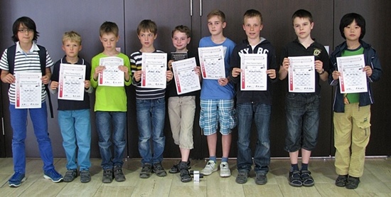 Melih, Georg, Christian, Andreas, Lukas, Leo Max, Frederik, Alexander und Ha-Young zeigten stolz ihre Urkunden - Leon Magnus hatten wir schon verabschiedet, weil er sonntags darauf zur 1.Heiligen Kommunion gegangen ist - ein guter Grund, ansonsten bleiben die Kinder immer bis zur Siegerehrung!