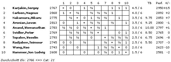 Mit einem ELO-Schnitt von 2766 wird die Turnierkategorie 21 erreicht.