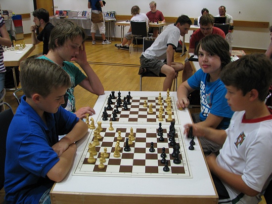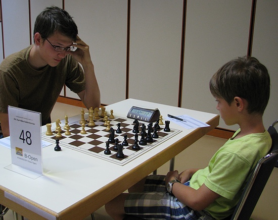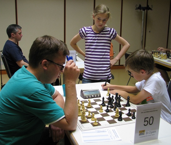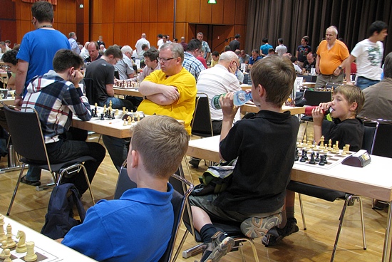 ... höher, weiter, schneller, ... Jungs wollen sich immer wieder messen, am liebsten jeden Tag, jede Stunde. Nicht nur in jeder Partie, sondern auch in jeder Pause oder der generellen Wartezeit zwischen den einzelnen Runden. Manchmal kommt mit dem Tandemspielen oder anderen Entspannungsformen des Schachs der kurze Eindruck auf, dass das gescheiteste Spiel auf diesem Globus auch ein bisschen Zeitvertreib bedeutet, aber nicht wirklich, bemerkt der interessierte Beobachter nach kurzem Hinhören: "Hau den Springer raus - ich brauch' einen Bauer - stell Dich nicht so an - mach schon - die Uhr tickt - wir verlieren auf Zeit - noch einen Springer sofort und er ist matt". Das Wettkampffieber ist auch zwischen den Runden deutlich spürbar. Schaut man in die Kinderaugen, dann kann man die Neugierde auf die nächste Partie lesen. Wann gehts endlich los! Doch es gibt auch schon die erfahrenen Cracks unter den 8- und 10-Jährigen - nichts scheint unbeliebter bei den erwachsenen Spielern zu sein, als die Begegnung mit einem unbekannten kleinen menschlichen Wesen. Jahrgang 2004, DWZ 1861 und 2 Punkte aus 2 Partien im A-Turnier - das ist schon eine undankbare Aufgabe für einen 2200er in der 3.Runde. Wie soll man sich da auf den "Zwerg" einstellen, wie soll man da dem unbekannten "Schachgenie" begegnen? Hauptvarianten oder unbekannte zweischneidige Nebenvarianten, Tretminen legen oder still kommentieren: "Na, hat Dein Trainer Dir das schon gezeigt?" ... und dann gibt es noch die schönen Begegnungen bei den Schülern zwischen beiden Geschlechter und Remisangebote in geschliffenen ganzen Sätzen: "Ich biete Dir remis an" und "Ich lehne Dein Remisangebot ab". Herrlich, dreimal dürfen Sie raten, wer wem hier ein Remisangebot in objektiv schlechterer Stellung machte und wer es zurückgewiesen hat! Mädchen oder Junge?
