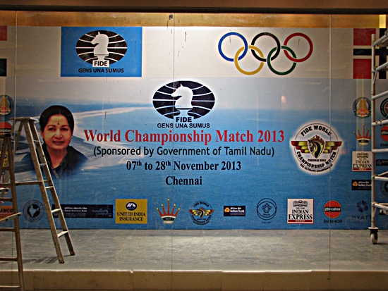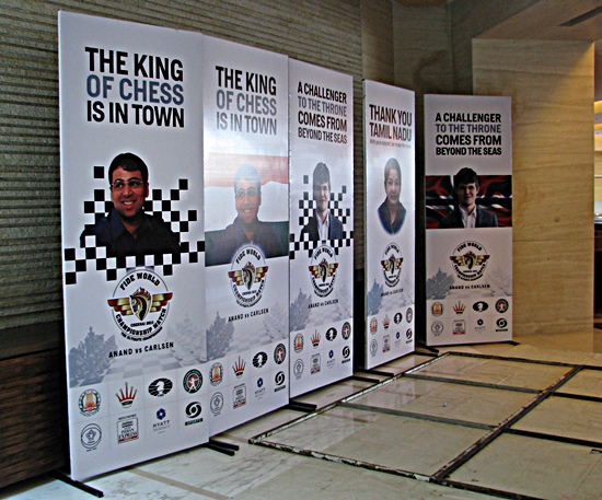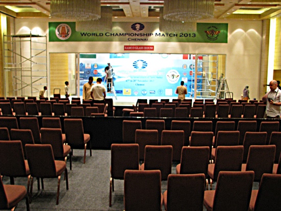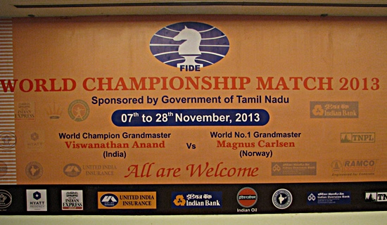 06.11.2013 - "Ruhe vor dem Sturm", die Teams des Titelverteidigers Viswanathan Anand aus Indien und des Herausforderers Magnus Carlsen aus Norwegen scheinen noch nie etwas anderes gemacht zu haben, als Weltmeisterschaften auszutragen. So routiniert hat man den Superstar Anand aus Indien in seinem Heimatland und -stadt vor eigenem Publikum und inmitten seines Teams, seiner Familie und seiner Landsleute erwartet, aber dass der junge unerfahrene Herausforderer Carlsen und sein Team genau das Gleiche zur Schau stellt, lässt auf sein riesiges Selbstvertrauen schließen - Respekt. Vishy muss spielen, wie ein "Junger Tiger", wenn er den brillanten Magnus Carlsen besiegen will, gibt der letzte Herausforderer Boris Gelfand aus Israel im Interview mit der "Times of India" bekannt und gibt seine zweite These zum Besten: "Die große Ratingdifferenz zwischen den Spielern ist das meistüberschätzte Argument" bei WM-Kämpfen, Carlsens Elo 2870 gegen Anands Elo 2775. Auf der Organisationsebene wirbelten gut 100 professionell arbeitende Inder und Inderinnen auf allen Ebenen im Hotel HYATT REGENCY und es sieht um 22:00 Uhr vor der morgigen Eröffnungszeremonie um 16:00 Uhr in einem großen Stadion alles sehr gut aus! (Siehe Bericht auch bei der Zeit-Online!) Der Sponsor aus Zürich, Oleg Skvortsov, schockt das Anand-Team mit der Aussage: "Ich glaube, Magnus Carlsen wird Weltmeister" und nach einer langen Pause, "aber nicht jetzt und hier!"