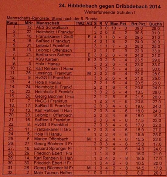 "Hibbdebach-Dribbdebach" - Das Albert-Einstein-Gymnasium aus Schwalbach am Taunus hielt die 8:2 Punkter auf Distanz und deklassierte im Finale das Leibnitz 1 Schule-Team mit 8:0. Den einzige Punkt mussten die Taunusstädter gegen die Franziskaner-Schule aus Groß-Krotzenburg abgeben. Mit einer Finalniederlage wären die Schwalbacher Jungs nur 2. geworden. Neben der Demonstration der Stärke konnte auch die Demonstration der Nerven aus Stahl dem Team attestiert werden, gerade deshalb, weil man letztes Jahr noch einen verlorenen geglaubten Wettkampf nach 1:4 Rückstand ausgleichte und so punktgleich mit 32,5 gegen 30,5 Brettpunkte zu siegen!