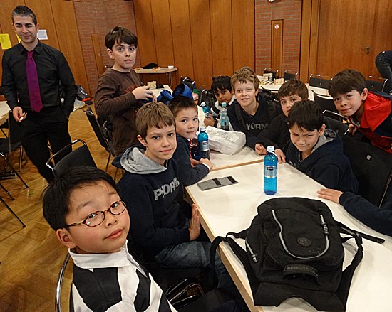 "Hibbdebach-Dribbdebach" - Die Jungs von der Phorms-Schule ganz locker und lässig beim Abfeiern und warten geduldig auf die Siegerehrung mit Ergebnisbekanntgabe. Der Sprung vom Vorjahr von Platz 16 auf Platz 5 (8. inklusive der externen Schulen) ist schon erwähnenswert, weil die Systematik beim Schachlernen an der Chess Tigers Universität Früchte trägt. Ganz links auf dem Bild ist der Extra Curricular Coordinator und Mannschaftsführer George Betts Bilinguale Schule mit Eingangsstufe, Grundschule und Gymnasium zu sehen.