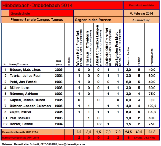 Schulschach Hibbdebach-Dribbdebach - Schulschach-Kultur in Frankfurt Chess Tigers Grundschulen mit einstelligen Plätzen: Anna-Schmidt-Schule Frankfurt, Geschwister-Scholl-Schule Schwalbach (Bronce) und Phorms-Schule Frankfurt - Albert-Einstein-Gymnasium - der unwiderstehliche Titelverteidiger mit 39 Punkten aus 40 Partien