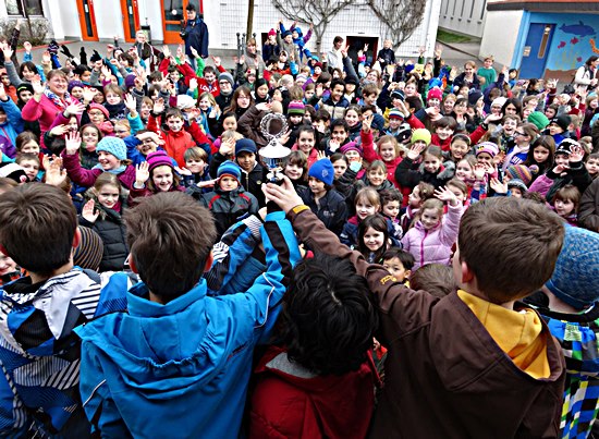 So sehen Sieger aus! Schließlich hatte jeder die Hand am Pokal, besser gesagt die Finger mit im Spiel beim Gedankenaustausch mit den anderen 26 Mannschaften der Grundschul-Klasse.