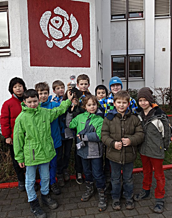 "Geschwister-Scholl-Schule" - Wie gefeierte Rockstars müssen sich die Jungs gefühlt haben, als der große Pokal an die Schulleiterin Frau Annette Rosenstock übergeben wurde. Sie haben etwas Wertvolles ihrer Schule nach Schwalbach in die Eschborner Str. 2 gebracht und zu Hause haben sie ihrem kleinen Erinnerungspokal an einen schönen Platz gegeben. "Das war der schönste Tag in meinem Leben", als er den großen Pokal noch einmal wehmütig und mit großem Stolz in den Händen der Schullleiterin noch einmal richtig ansah, " ... und ich war dabei!"