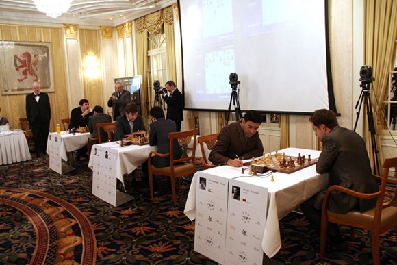15.02.2015 - Auch in der zweiten Runde der 4. Zürich Chess Challenge gab es nur eine entschiedene Partie. Viswanathan Anand spielte gegen Levon Aronian eine scharfe Variante im Grünfeldinder, die sein Gegner ebenfalls zu kennen glaubte. Aber an der entscheidenden Stelle stellte der Armenier entsetzt fest, dass nur sein Gegner wusste, wie die Stellung zu spielen war. Obwohl Aronian eine Mehrfigur hatte, fiel die schwarze Verteidigung zusammen wie ein Kartenhaus. Auch die beiden Remispartien zwischen Vladimir Kramnik und Hikaru Nakamura beziehungsweise Sergey Karjakin und Fabiano Caruana waren sehr gehaltvoll und endeten mit einem gerechten Ergebnis. Damit hat Anand nach Punkten mit Nakamura gleichgezogen und ziert mit dem Amerikaner die Spitze der Tabelle. In Runde 3 hat Vishy Schwarz gegen Caruana, Nakamura Weiß gegen Karjakin wie auch Aronian gegen Kramnik. Anpfiff ist wie zuvor um 15 Uhr.