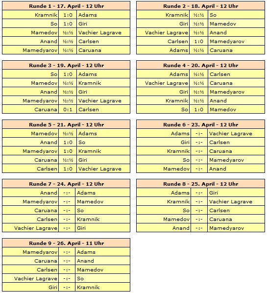 Rundenstart ist täglich um 12 Uhr, lediglich die letzte Runde beginnt eine Stunde früher. Der einzige Ruhetag wird am 22. April eingelegt.