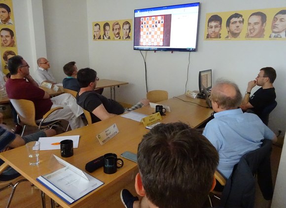 Wie immer, blendend vorbereitet, GM Michael Prusikin in seinem Element. Er leistet sogar noch Analysearbeit über Nacht, wenn am Vortag ihm irgend etwas "Spanisch" vorkommt.