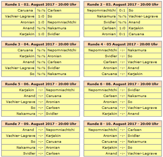 Sollte es am Ende zu einem Gleichstand um Platz 1 kommen, wird am 12. August ein Schnellschach- und ggf. Blitz-Tiebreak gespielt.