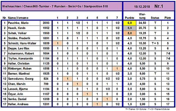 Die Ankündigung des Geschäftsführers Hans-Walter Schmitt zum Turniermodus entzückte die meisten Teilnehmer, aber es trieb auch manchen älteren und jüngeren Puristen den Schweiß auf die Stirn. Die erste Aussage war: es wird Chess960 gespielt (nur eine Position bei sieben Runden, um den "Liebhaben und Verstehen"-Effekt dieser Startposition zu steigern, das sogenante "Fortschrittsprinzip" sollte erkundet werden. Die drei jüngsten Teilnehmer sollten mit einem 10er-Würfel die definierte Startposition ermitteln: zuerst Arin mit einer 5, danach Marvin mit einer 1 und schließlich Konstantin mit einer 8!! Also die 518 - Insider wussten sofort Bescheid, trotzem wurde Fritz16 bemüht die Anfangsstellung auf dem großen 65" Sony-Flatscreen anzuzeigen. Die Sensation war, dass zum ersten Mal seit Beginn der ersten Chess960-Turniere im Jahre 2000 in Bad Soden am Taunus diese Startposition ausgewählt worden ist! Und Sie wird gespielt, anderenfalls würde das Spiel ja Chess959 heißen. Unglaublich unsere Jüngsten würfelten wie Helden des Zeitgeschehens - ein Zeichen für die Zukunft des Schachs? Siehe untenstehende Tabelle! Was hätte man in Londen zwischen Carlsen und Caruana erleben können, wenn da so vorgegangen worden wäre. Vorteil klar bei Carlsen, er hat im Chess960 unlängst seinen Vorgänger Chess960-Weltmeister Hikaru Nakamura aus der USA geschlagen.