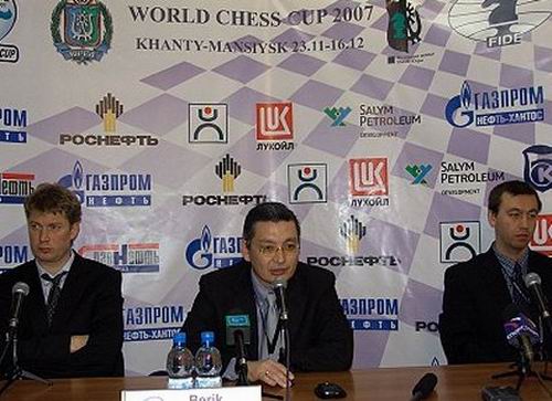 Die finale Pressekonferenz des World Cup Khanty-Mansiysk 2007 v.l.n.r: Alexei Shirov (80.000 $) - Fide: Balgaev - Gata Kamsky (120.000 $)