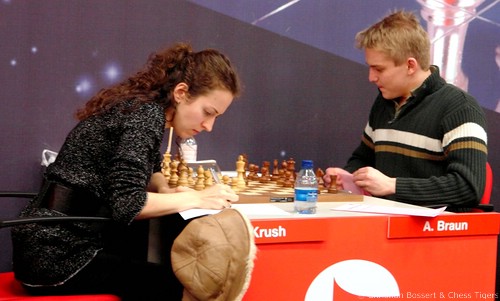 24.01.2008 - In einer turbolenten Partie gegen den Heimspieler Loek van Wely verteidigte sich der Wikinger Magnus Carlsen mit dem agressiven Wolga-Gambit (Benkö) und stand nach ein paar unkorrekten Zügen im Mittelspiel total Pleite. Sein Erfindungsreichtum wurde aber noch vom Zeitnot geplagten Loek van Wely belohnt, indem er noch vor der ersten Zeitkontrolle in eine aussichtslose Stellung mit Mattfinale geriet. Zwischendurch stand KingLoek mit +6,86 (Fritz11) besser - entspricht fast dem Gegenwert von Turm und Leichtfigur. Das innerukrainische Duell zwischen dem Aufsteiger aus der B-Gruppe Pavel Eljanov und Vassily Ivanchuk endete nach langem Kampf mit einem Sieg für den älteren Haudegen "Chucky".