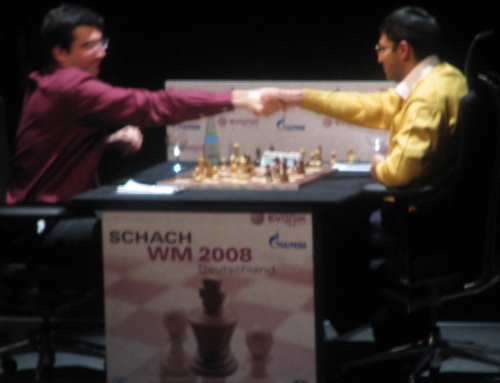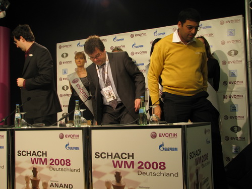 24.10.2008 - Am nächsten Sonntag könnte Viswanathan Anand seine Titelverteidigung unter Dach und Fach bringen. Mit einem Weiss-Sieg wären die notwendigen 6,5 Punkte erreicht, mit einem Weiss-Remis wäre auf jeden Fall schon der Tiebreak erreicht, mit einem Weiss-Verlust hätte er weitere 3 Versuche in drei Partien zu gewinnen. So souverän wie er hier in Bonn auftritt, fällt es den Experten sehr schwer an Wunder zu glauben. Doch halt, war es nicht einer dieser beiden Wettkämpfer, der in Serie der Partien 3 bis 6 mit 1, ½, 1, 1 = 3,5 Punkte einspielte, also kein Ding der Unmöglichkeit, denn irgendwann muss auch der Inder Anand doch einmal einen Fehler machen.