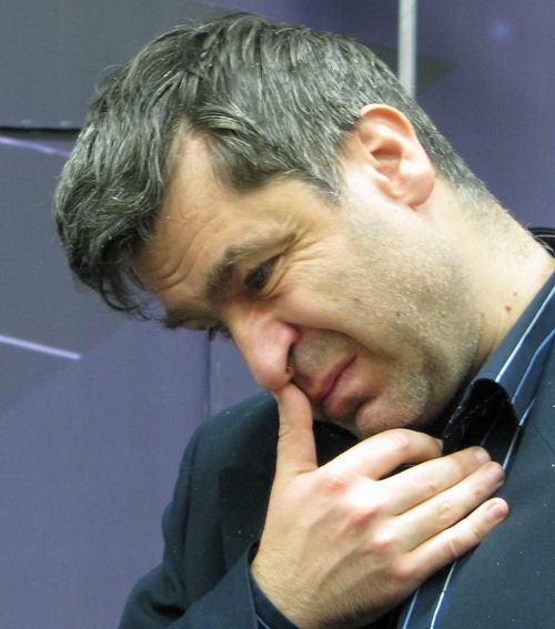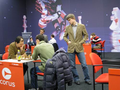 24.01.2009 - Mit einem blitzsauberen Schwarzsieg gegen den Ukrainer Vassily Ivanchuk konnte sich Sergei Movsesian in einem Scheveninger-System der Sizilianischen Partie zu dem jungen Ukrainer Karjakin an die Spitze der Tabelle hoch katapultieren. Der junge Co-Leader bevorzugte heute eine sehr ruhige Gangart gegen den Armenier Aronian. In einem geschlossenen Spanier bot er im 18.Zug remis an, welches der Wahlberliner akzeptierte. Alexander Morozevich konnte in der 7.Runde gegen den überraschend stark aufspielenden, letztgesetzen Niederländer Jan Smeets, endlich seinen ersten Sieg einfahren. Dabei unterstützte der Smeets ihn entscheidend mit 48.Zug mit Sc4, der sofort die Partie einstellte. Der zweite junge Holländer Daniel Stellwagen konnte sich in einer ganz langen Partie mit einem Dauerschach gegen den US-Amerikaner Gata Kamsky ins Remis retten. Im 67.Zug konnte Kamsky mit Kb5 anstatt mit Dc4 gewinnen. Das 15-zügige Remis zwischen Mickey Adams und Teimour Radjabov traf nicht den Publikumsgeschmack und ist indiskutabel. Die Remis von van Wely gegen Carlsen und Leinier Dominguez gegen Wang Yue gingen dagegen völlig in Ordnung.