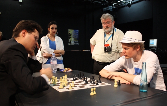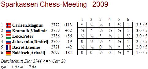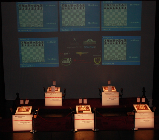07.07.2009 - Die gestrige fünfte Runde beim Sparkassen Chess-Meeting sah zum ersten Mal in diesem Jahr zwei entschiedene Partien. Während Vladimir Kramnik und Dimtry Jakovenko zeitig Frieden schlossen, wurde zwischen Magnus Carlsen gegen Arkadij Naiditsch und Peter Leko gegen Etienne Bacrot erbittert um den vollen Punkt gerungen. Nachdem es Carlsen gegen die Berliner Verteidigung seines deutschen Kollegen gelungen war, tatsächlich etwas Vorteil aus der Eröffnung zu pressen, spielte Naiditsch das Mittelspiel sehr stark und hatte das Remis fast schon vor Augen. Doch dann verrechnete er sich im Endspiel und Carlsen nutzte die Gelegenheit, wieder die alleinige Führung zu übernehmen, unbarmherzig aus. Bacrot dagegen geriet gegen Leko aus einem Dameninder heraus rasch in eine bedenkliche Lage und verlor, als ihn der Ungar per Königsangriff weiter unter Druck setzte, den Überblick. Leko ließ sich nicht lange bitten und beendete die Partie kurz und schmerzlos per Turmopfer. Heute ruhen die Stars, bevor es morgen in die zweite Turnierhälfte mit vertauschten Farben geht.