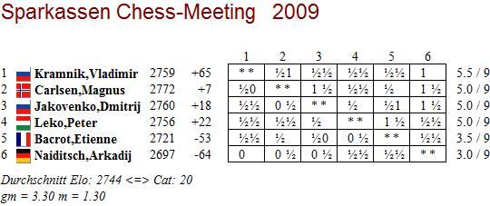 11.07.2009 - Sämtliche Begegnungen der achten Runde beim Sparkassen Chess-Meeting endeten mal wieder ohne Sieger. Dabei bekamen die Zuschauer zumindest drei völlig unterschiedliche Punkteteilungen geboten. Den Anfang machten Etienne Bacrot und Peter Leko mit einem klassischen Kurzremis nach 17 Zügen. Etwas filigraner folgten Arkadij Naiditsch und Magnus Carlsen, indem sie eine bekannte Sveshnikov-Variante runterspulten und dann binnen kürzester Zeit so viel Material tauschten, bis das Remis offensichtlich war. Deutlich länger plagten sich dagegen Dmitry Jakovenko und Vladimir Kramnik. Jakovenko hat ohnehin mit Abstand die meiste Zeit aller Spieler am Brett verbracht und auch heute wurden es 56 Züge. Im Vergleich zu den anderen beiden Remis hätte es in dieser Partie jedoch gut und gerne einen Sieger geben können, denn im 33. Zug ließ Kramnik eine aussichtsreiche Möglichkeit aus, die wahrscheinlich gewonnen und ihm den neunten Sieg beim Chess-Meeting eingebracht hätte. So allerdings entkam Jakovenko ins Remis und vertagte die Entscheidung auf das morgige Finale, welches übrigens schon um 13 Uhr beginnen wird.