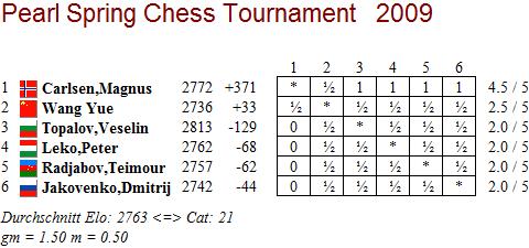 Theoretisch müsste man als Berichterstatter spätestens jetzt alle möglichen Superlativen auf Magnus Carlsen anwenden, aber das 2. Pearl Spring Chess Tournament ist erst zur Hälfte vorüber! Wer weiß, was der beste norwegische Schachspieler aller Zeiten noch so treiben wird. Die jetztigen Zahlen jedenfalls sind bereits gigantisch: 4,5 Punkte aus 5 Partien, eine Performance von 3143 und in der Live Top List mit 2791,4 auf Rang zwei vorbei an Weltmeister Vishy Anand mit der historischen Möglichkeit, die 2800-Schallmauer zu durchbrechen und Veselin Topalov (2803,8) vom Thron zu stossen. Die Meinungen, ob dies unmittelbar dem Training mit Garry Kasparov zuzuschreiben ist oder der junge Mann einfach nur einen Lauf hat, gehen auseinander, aber über eine Tatsache sind sich alle Experten einig: Magnus Carlsen wird in absehbarer Zeit die Führung in der Weltrangliste übernehmen und auch der Weltmeistertitel ist schon so gut wie sicher. Letzteres wird aber noch eine ganze Weile dauern, denn zuvor werden sich Viswanathan Anand und Veselin Topalov um diese Krone duellieren, sofern zumindest einer der drei offiziellen Bewerber (Bulgarien, Singapore und Türkei) bis zum 15. Oktober in der Lage ist, für die Finanzen zu garantieren, wie man auf der Homepage der FIDE nachlesen kann.