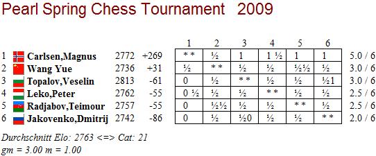 04.10.2009 - Mit Mut und einer gehörigen Portion Glück gelang Veselin Topalov als Schwarzer gegen Dmitrij Jakovenko in der sechsten Runde des 2. Pearl Spring Chess Tournament in Nanjing ein Angriffssieg, der ihn auf den zweiten Rang vorstoßen lässt. Teilen muss er sich diesen mit Wang Yue, welcher gegen Teimour Radjabov remisierte. Ebenfalls mit einem Remis endete die Partie zwischen Peter Leko und Magnus Carlsen. Bereits im 20. Zug konnte der Ungar seinen d-Bauer umwandeln und so eine Qualität gewinnen. Fortan kämpfte Carlsen um das Remis, doch das tat er gut und sicherte sich nach 64 Zügen verdient den halben Zähler.
