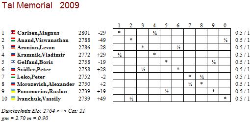 05.11.2009 - Gut gespielt, aber doch nicht gewonnen, das kennen auch die besten Spieler der Welt. Ein Paradebeispiel dafür war die heutige erste Runde des stärksten Rundenturniers im auslaufenden Jahr. Im Fokus standen natürlich die Partien zwischen Weltmeister Viswanathan Anand und Vorjahressieger Vassily Ivanchuk sowie Magnus Carlsen gegen Vladimir Kramnik. Es sollten tatsächlich die längsten und interessantesten Begegnungen werden, obwohl sie letztlich wie die anderen drei Partien im Remishafen endeten. Somit führen alle zehn Teilnehmer des Tal Memorial 2009 nach der ersten Runde einträchtig die Tabelle an.