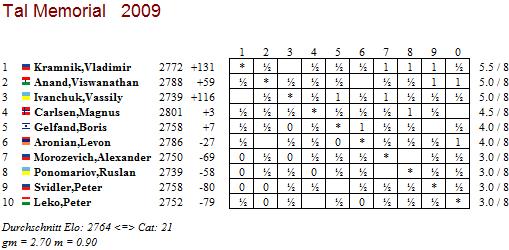 TopTurniere Tal Memorial 2009 - Carlsen siegt, Kramnik führt Letzte Runde morgen 13 Uhr