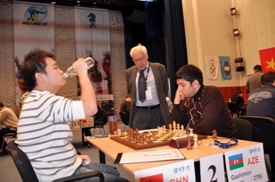 Während Li Chao b seinen Flüssigkeitshaushalt regulierte, grübelte Vugar Gashimov über Gewinnideen gegen den Chinesen. Vergebens, auch der Aserbaidschaner muss in den Tiebreak