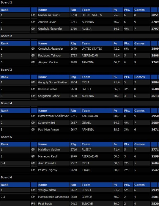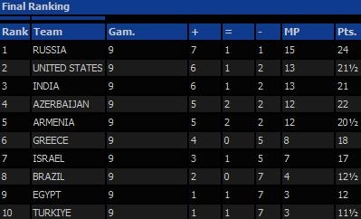 13.01.2010 - Ende Oktober hatte das russische Team bei der Europameisterschaft noch mit dem Silberrang hinter Aserbaidschan leben müssen, doch bei der just beendeten Weltmeisterschaft darf sich die erfolgsverwöhnte Nation endlich wieder über Gold freuen. Nach einem spannenden Kopf-an-Kopf-Rennen über neun Runden mit den USA siegten Alexander Grischuk, Alexander Morozevich, Vladimir Malakhov, Dmtrij Jakovenko, Evgeny Tomashevsky und Nikita Vitiugov sowie Kapitän Alexander Motylev mit zwei Mannschaftspunkten Vorsprung auf die Amerikaner. Bronze geht mit nur einem halben Brettpunkt Rückstand an Indien. Enttäuscht weil ohne Medaille sind sicherlich die Aserbaidschaner und die Armenier auf Rang beziehungsweise 6. Das beste Einzelergebnis aller Spieler erzielte der Aserbaidschaner Shakhriyar Mamedyarov mit 8/9 und einer Performance von 2950 am vierten Brett. Ebenfalls Gold gewannen Hikaru Nakamura (USA) an Brett 1 (6/8), Alexander Onischuk (USA) an Brett 2 (6,5/9), Surya Shekhar Ganguly (IND) an Brett 3 (5/7), Vladimir Malakhov (RUS) an Brett 5 (5/7) und Nikita Vitiugov (RUS) an Brett 6 mit 5,5/6.