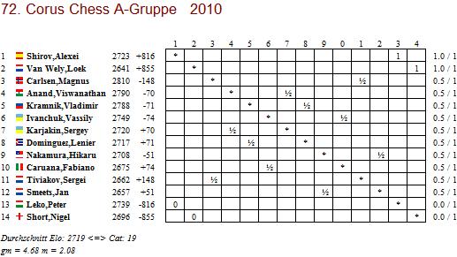 Schmerzhafte Niederlage von "Turnier-Opa" Nigel Short, der die C-Gruppe als "Kindergarten-Gruppe" bezeichnet. Natürlich mit einem Augenzwinkern angesichts der Tatsache, dass keiner der dortigen Spieler das Licht der Welt erblickt hatte, als der Brite 1986 und 87 das Corus gewinnen konnte.
