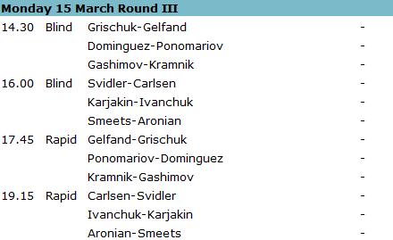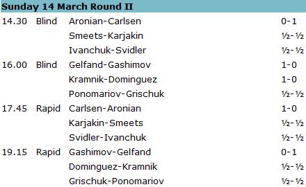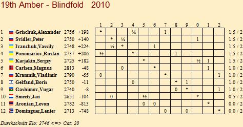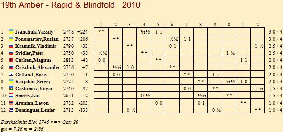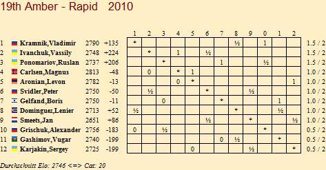 14.03.2010 - Der zweite Tag beim 19. Amber Chess Tournament 2010 hat nicht an der ukrainischen Doppelführung rütteln können. Sowohl Vassily Ivanchuk als auch Ruslan Ponomariov genügte es heute, ihre beiden Partien gegen Peter Svidler beziehungsweise Alexander Grischuk zu remisieren, um den Platz an der Sonne in der Gesamtwertung zu behalten. Herausragen konnten lediglich Magnus Carlsen und Boris Gelfand. Der Norweger konnte nach seiner gestrigen Doppelnull heute zwei Siege gegen Levon Aronian landen und der Israeli tat es ihm im Duell gegen Vugar Gashimov gleich. Insgesamt war die zweite Runde mit insgesamt sieben Unentschieden deutlich friedlicher als die gestrige.