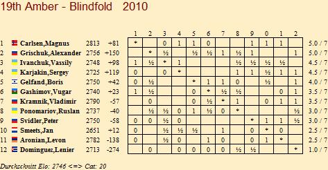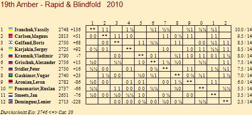 20.03.2010 - Wer geglaubt hat, das 19. Amber Chess Tournament 2010 würde nun zur Carlsen Show werden, sieht sich nach der siebten Runde eines Besseren belehrt. Noch ist es nicht so, dass den Gegnern des Norwegers die Knie schlottern, wenn sie gegen diesen spielen müssen. Das beste Beispiel dafür lieferte Vugar Gashimov, denn der Aserbaidschaner schlug Carlsen zunächst in der Blindpartie und beinahe wäre ihm das auch noch im Schnellschach gewonnen, doch dort entkam die Nummer 1 der Weltrangliste letztlich ins Remis. Übrigens das erste Remis im gesamten Turnierverlauf für Carlsen! Prompt ließ sich Vassily Ivanchuk nicht lumpen und übernahm mit seinem 1,5:0,5 gegen Alexander Grischuk gerne wieder die alleinige Führung in der Gesamtwertung. Das einzige 2:0 des Tages erzielte Sergey Karjakin gegen Ruslan Ponomariov und schob sich somit zu Boris Gelfand auf den dritten Rang vor. Der Israeli besiegte Jan Smeets mit 1,5:0,5. Und während Peter Svidler mit etwas Fortune mit dem gleichen Ergebnis gegen Leinier Dominguez die Oberhand behielt, endete lediglich das Duell zwischen Vladimir Kramnik und Levon Aronian unentschieden. Nachdem die russische Nummer 1 gegen die armenische Nummer 1 im Blindschach siegte, revanchierte sich Letzterer postwendend in der Schnellpartie.