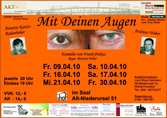 26.03.2010 - Dass wir Schachspieler eine eigene, eine besondere Spezies sind, wir wissen es und die Nicht-Schachspieler vermuten es. Damit können wir auch sehr gut leben, ja, wir sind sogar mitunter stolz darauf. Doch bei einem Vorurteil über uns verstehen wir nun wirklich keinen Spaß! Schachspieler seien langweilig und humorlos, heißt es. Man kann sich eben nicht vorstellen, dass Menschen, die sich mit diesem intellektuellen Spiel auskennen, sich auch der Kurzweil, dem Gaumenkitzel, dem Ulk hinzugeben vermögen. Zugegeben, es sind nicht unbedingt Palim-Palim und die berühmt-berüchtigte Flasche Pommes frites, die dem durchschnittlichen Schachspieler Lachtränen in die Augen treiben, doch davon abgesehen ist unser Komikzentrum im Gehirn in der Regel völlig intakt. Sprich: Der gemeine Klötzchenschieber lacht gerne und er bringt auch gerne zum Lachen! Den Beweis dafür liefert der Frankfurter Landesklassenspieler Andreas Weber an insgesamt sechs Tagen im kommenden April mit seinem AKT Frankfurt Komödientheater. Mit Karl spielt Weber in der Kömodie „Mit Deinen Augen“ von Frank Pinkus die Rolle eines vermeintlich Verrückten, der mit seiner ganz eigenen Sicht der Dinge, das Leben der Anwältin Anna, gespielt von Annette Keutz-Rodenheber, gehörig auf den Kopf stellt.