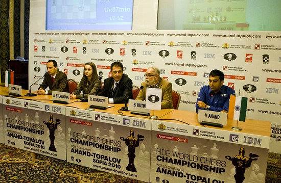 Die Pressekonferenz nach der dritten Partie v.l.n.r.: Herausforderer Veselin Topalov, Kommentatorin A. Stefanova, Übersetzer R. Anatasov, ECU Präsident B. Kutin und Weltmeister Viswanathan Anand