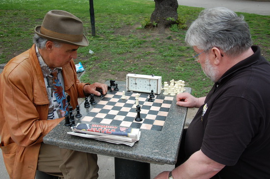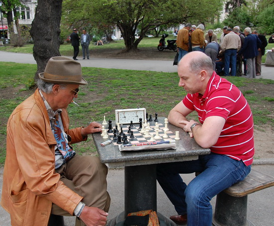 Hier wird vor dem Grand Hotel Sofia um den Einsatz von 2-10 Leva (1-5 Euro) gezockt, teilweise sind über 50 Schachspieler und Kiebitze gezählt worden - im Military Club bei den WM-Spielen kaum die Hälfte. Wie erkären sich das die bulgarischen Ausrichter und der Manager von Veselin Topalov?