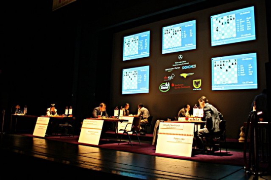 18.07.2010 - Nach vier Runden hat Shakhriyar Mamedyarov beim Sparkassen Chess-Meeting in Dortmund die alleinige Führung übernommen. Die dafür nötige Schützenhilfe leistete ihm der wahre Held des Tages Liem Quang Le. Der 19-jährige Vietnamese holte den ersten vollen Punkt seiner noch jungen Karriere in einem Top Turnier und das gleich mal gegen den bisher recht souveränen Ruslan Ponomariov. Somit reichte Mamedyarov ein Remis gegen Vladimir Kramnik, welches er mit den schwarzen Steinen locker nach 31 Zügen in der Tasche hatte. Deutlich länger dauerte das Duell zwischen Arkadij Naiditsch und Peter Leko. 55 Züge lang versuchte Naiditsch mehr, als das sichere Remis aus dem Ungarn herauszupressen, doch dieser verteidigte sich gewohnt sicher und ließ auch im Turmendspiel mit Minusbauer nur bei sehr optimistischen Arkadij-Fans Hoffnungen auf einen vollen Punkt für den Deutschen aufkommen. Unter dem Strich steht ein gerechtes Unentschieden und das Warten auf den ersten Sieg unserer Nummer 1. Derweil hat sich im Dortmunder Schauspielhaus für den 22. Juli hoher Besuch angekündigt. Anatoly Karpov, seines Zeichens der zwölfte Schachweltmeister und aktueller Kandidat für das Amt des FIDE Präsidenten, wird seine Aufwartung machen und die siebte Runde eröffnen. Im Anschluss wird es ab 16:00 Uhr eine Pressekonferenz und einen Fototermin mit ihm geben.