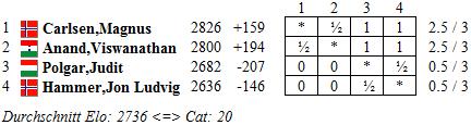 Heute um 14:30 Uhr werden die ersten drei Runden nochmals mit vertauschten Farben wiederholt. Am Montag dann werden Anand und Carlsen das große und Polgar und Hammer das kleine Finale ausspielen. Die Bedenkzeit in Kristiansund beträgt 20 Minuten plus 10 Sekunden.
