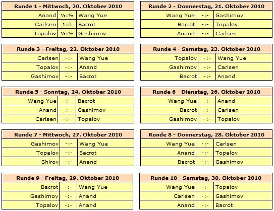 Durch die enorme Zeitverschiebung ist es bei uns noch ziemlich früh am Tag, wenn sich die Spieler ans Brett setzen. Um 8:30 Uhr unserer Zeit werden die Runden beginnen, und die letzte Runde wird gar schon um 4:00 Uhr in der Früh beginnen. Der einzige Ruhetag wird am 25.10. eingelegt.