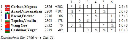 In Nanjing wird ein doppelrundiges Turnier gespielt (also 10 Runden) mit der Bedenkzeit 120 Minuten/40 Züge + 60 Minuten/20 Züge + 15 Minuten + 30 Sekunden/Zug ab dem 61. Zug. Mit einem Elo-Schnitt von 2766 wird die Kategorie 21 erreicht. Man treibt seitens der Organisation wie im vergangenen Jahr die so genannte Sofia-Regel auf die Spitze, indem man Remisangebote nur in theoretischen Remisstellungen – als eigentlich gar nicht – erlaubt. Doch wirklich eingehalten wird diese Regelung in der Praxis offenkundig nicht.