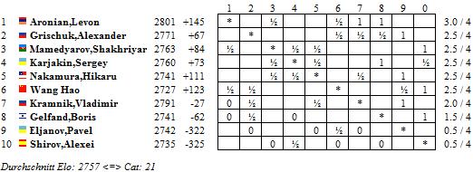 08.11.2010 - Würde man behaupten, die Stars beim Tal Memorial 2010 hätten sich bei den fünf Unentschieden in der vierten Runde einen vorzeitigen Ruhetag gegönnt, dann müsste man lügen. An allen Brettern wurde nach Kräften gekämpft, wobei Hikaru Nakamura mit Weiß gegen Vladimir Kramnik dem Sieg nahe schien, aber im Dschungel der taktischen Möglichkeiten traute sich der Amerikaner nicht, aufs Ganze zu gehen. Bei Twitter schreibt der Chess960-Weltmeister von einer wahnsinnigen Partie und einer (aus)lachenden Rybka. Auch zwischen Boris Gelfand und Alexander Grischuk geriet die Partie zu Gunsten des Russen ins Ungleichgewicht, doch der Israeli fand den schmalen Weg ins Remis. Somit führt weiterhin Levon Aronian das Feld mit einem halben Zähler Vorsprung an. Morgen wird in Moskau zum Gedenken an den Geburtstag von Mikhail Tal - der achte Weltmeister wäre 74 geworden - geruht. Am Mittwoch steht dann die fünfte Runde an.
