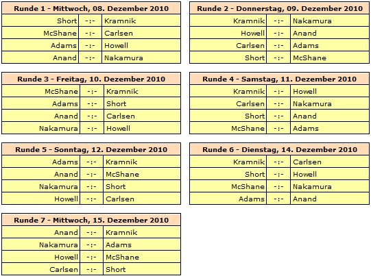 Der Modus in London ist 120 Minuten/40 Züge + 60 Minuten/20 Züge + 15 Minuten + 30 Sekunden/Zug ab dem 61. Zug, und es wird nach den so genannten Sofia-Regeln gespielt. Rundenstart ist täglich 15:00 Uhr unserer Zeit. In London geht es um 14:00 los, aber dort ist man durch die Zeitverschiebung auch eine Stunde hinter uns her. Die zweite Runde beginnt erst um 17:00 Uhr und die letzte Runde bereits zwei Stunden früher als sonst - also bei uns um 13:00 Uhr. Einen Ruhetag wird es geben - und zwar am kommenden Montag (13. Dezember). Von den drei erklärten Favoriten Anand, Carlsen und Kramnik hat ersterer viermal Weiß und dreimal Schwarz, während die beiden anderen dreimal Weiß und viermal Schwarz haben. Was nach einem Vorteil für den Weltmeister klingt, könnte sich bei einem Gleichstand am Ende jedoch negativ auswirken, denn das erste Kriterium wäre in diesem Fall die Anzahl der Schwarzpartien. Erst als fünftes Kriterium ist ein Tiebreak bis zum Armageddon vorgesehen.