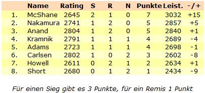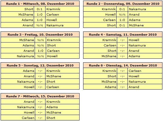Der Modus in London ist 120 Minuten/40 Züge + 60 Minuten/20 Züge + 15 Minuten + 30 Sekunden/Zug ab dem 61. Zug, und es wird nach den so genannten Sofia-Regeln gespielt. Rundenstart ist täglich 15:00 Uhr unserer Zeit. In London geht es um 14:00 los, aber dort ist man durch die Zeitverschiebung auch eine Stunde hinter uns her. Die letzte Runde beginnt bereits zwei Stunden früher als sonst - also bei uns um 13:00 Uhr. Einen Ruhetag wird es geben - und zwar am kommenden Montag (13. Dezember). Für den Fall eines Gleichstandes am Ende ist das erste Kriterium die Anzahl der Schwarzpartien. Danach werden die Schwarzsiege gezählt, dann die Siege mit beiden Farben und dann soll der direkte Vergleich entscheiden. Erst als fünftes Kriterium ist ein Tiebreak bis zum Armageddon vorgesehen.