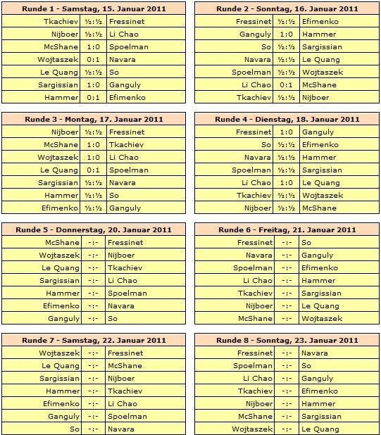 Die B-Gruppe führt nicht überraschend weiterhin Luke McShane an. Vor der vierten Runde hatte der Brite bereits einen ganzen Punkt Vorsprung auf die unmittelbare Konkurrenz, so dass ihm heute das Remis gegen Friso Nijboer völlig reichte, um vor dem morgigen Ruhetag alleine an der Spitze zu bleiben. Mit seinem Sieg über Surya Ganguly konnte Laurent Fressinet in die Verfolgergruppe einziehen, die jedoch weiterhin einen vollen Zähler Rückstand hat.