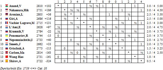 18.01.2011 - Nach der vierten Runde der A-Gruppe beim Tata Steel Chess Tournament in Wijk aan Zee hat Weltmeister Viswanathan Anand erneut die Tabellenführung erobert. Mit einer starken Neuerung in der Sämisch-Variante des Nimzoinders überraschte der Inder den Chinesen Wang Hao und fuhr einen überzeugenden Sieg ein. Schneller war da nur Levon Aronian nach einem kapitalen Verrechner von Ian Nepomniachtchi. Wenn man es ganz genau will, hätte der Russische Landesmeister bereits nach nur 10 Zügen aufgeben können, aber aus verständlichen Gründen zögerte er das Ende noch bis zum 26. Zug hinaus. Völlig außer Form ist offenkundig Alexei Shirov, der gegen den Franzosen Maxime Vachier-Lagrave taktisch den Kürzeren zog. Die längste Partie der vierten Runde war die zwischen Anish Giri und Hikaru Nakamura. Der 16-Jährige setzte dem Amerikaner mächtig zu, aber letztlich konnte dieser ein Turmendspiel mit Minusbauer erreichen und dieses remis halten. Somit führen nun gemeinsam Vishy und Naka vor Aronian, Giri und Vachier-Lagrave mit einem halben Zähler Rückstand.