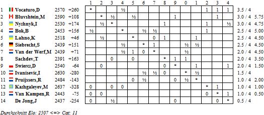 In der C-Gruppe hat Daniele Vocaturo den ersten Platz in der Tabelle eingenommen. Dafür musste er mit Schwarz Jan Willem de Jong schlagen, was ihm auch gelang. Zurückgefallen ist dagegen Kateryna Lahno nach ihrer Niederlage gegen IM Mark van der Werf. Sehr spannend war auch wieder die Partie von Sebastian Siebrecht. Der Deutsche geriet aus der Eröffnung in eine schwierige Lage, doch mit Hilfe seines Gegners Ivan Ivanisevic erarbeitete er sich letztlich ein verdientes Remis und darf somit bisher ungeschlagen den Ruhetag genießen.