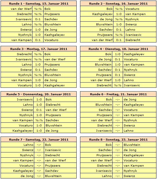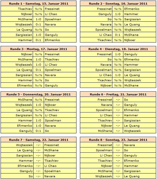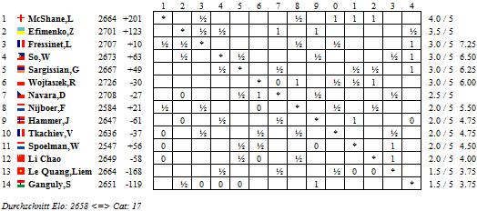 Die B-Gruppe wird weiterhin von Luke McShane angeführt, welcher sich heute ein Remis gegen Verfolger Laurent Fressinet gönnte. Das nutzte Zahar Efimenko, um mit seinem Sieg gegen David Navara den Rückstand auf nur noch einen halben Zähler zu verkürzen und den alleinigen zweiten Rang einzunehmen. Im Vergleich zu seinem Landsmann in der A-Gruppe konnte der Norweger Jon Ludvig Hammer gegen Wouter Spoelman endlich auch seinen ersten Sieg landen und die rote Laterne an Liem Quang Le und Surya Ganguly übergeben.