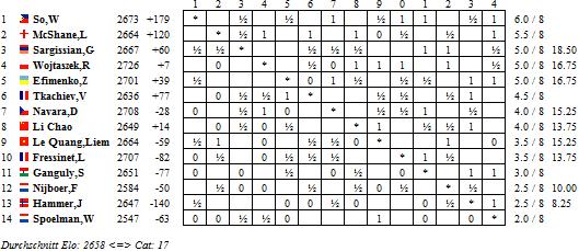 Nach einer kurzen Schwäche in der sechsten Runde hat Daniel Vocaturo die C-Gruppe wieder fest im Griff. Der Italiener schlug Mark van der Werf und hat nun wieder einen ganzen Punkt Vorsprung auf die Konkurrenz, da Illya Nyzhnyk gegen Ivan Ivanisevic die erste Niederlage im Wettbewerb quittieren musste. Sehr erfreulich aus deutscher Sicht ist, dass Sebastian Siebrecht (Bild) mal wieder voll punkten konnte. Der Essener bezwang Robert van Kampen, stoppte so den Abwärtstrend der drei zurückliegenden Runden und hat sein strahlendes Siegerlächeln wiedergefunden.
