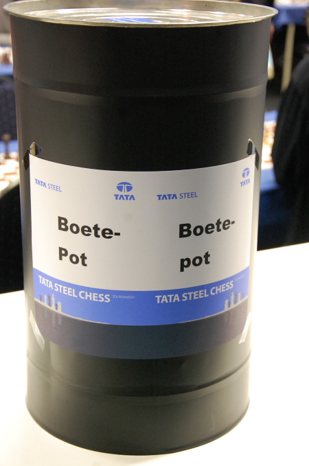 Und zum Abschluss der gefürchtete Boete-Pot - aufgestellt für Teilnehmer und Besucher, die im Turniersaal nicht die Hände vom Handy lassen können. Wer das erste Mal erwischt wird, muss - natürlich gegen Quittung - 10,- Euro hineinwerfen. Beim zweiten Mal kostet es schon 25,- Euro, und beim dritten Mal muss man den Spielsaal verlassen