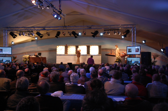 Während man auf Monitoren das Geschehen in der Halle verfolgen kann, werden auf der Bühne des Kommentatorenzelts die Spitzenpaarungen erklärt