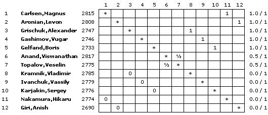 12.03.2011 - Heute fiel der offizielle Startschuss für das 20. Amber Chess Tournament. Begonnen wurde traditionell mit Blindschach, und die zahlreichen Kiebitze bekamen sogleich einige "Überseher" serviert. Besonders geärgert haben dürfte sich Anish Giri, denn dieser hatte gegen Levon Aronian mit Dame für zwei Läufer eine glatte Gewinnstellung erreicht, aber der findige Armenier sorgte so lange für maximale Verwirrung, bis sein junger Gegner schließlich einbrach und tatsächlich noch verlor. Mit großer Spannung war auch das zweite Aufeinandertreffen zwischen Weltmeister Viswanathan Anand und Veselin Topalov seit der WM 2010 in Sofia erwartet worden. Anand erreichte in der Blindpartie die bessere Stellung, gewann im Endspiel einen Bauern und letztlich auch die Partie, wobei Topalov am Ende vermutlich eine Chance zum Remis verpasste. Unter dem Strich wurden fünf der sechs heutigen Blindpartien entschieden, lediglich Hikaru Nakamura und Magnus Carlsen trennten sich nach hartem Fight unentschieden, wobei der Amerikaner kurz vor dem Ende gleich zweimal einzügig seinen Turm einstellte, was sein norwegischer Gegenüber jedoch genauso oft "übersah". In der ersten Schnellschach-Session dann wurden die Visiere allenthalben so richtig hochgeklappt. Giri und Aronian beispielsweise stürzten sich regelrecht aufeinander, und erneut hatte letzterer - seines Zeichens immerhin der amtierende Schnellschach-Weltmeister - die Nase vorn und gewann so sein erstes Mini-Match mit 2:0. Selbiges gelang auch Vugar Gashimov gegen Vassily Ivanchuk. Ebenfalls voll punkten konnte Carlsen gegen Nakamura. Der Chess960-Weltmeister mutete seinen König einfach zu viel zu und wurde von der Nummer 2 der Weltrangliste sehenswert überspielt. Besonders zufrieden mit dem ersten Tag dürfte auch Alexander Grischuk sein, denn ihm wurde die seltene Freude zuteil, gleich zwei Partien in Serie gegen Vladimir Kramnik zu gewinnen. Das Führungsquartett an der Spitze der Gesamtwertung komplettiert Boris Gelfand. Der Israeli schlug gegen Sergey Karjakin ebenfalls doppelt zu. Auch beim Schnellschach endete nur eine Partie remis. Anand und Topalov teilten gerecht den Punkt.