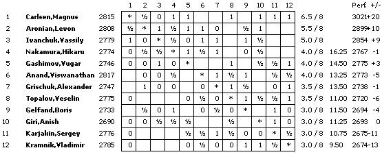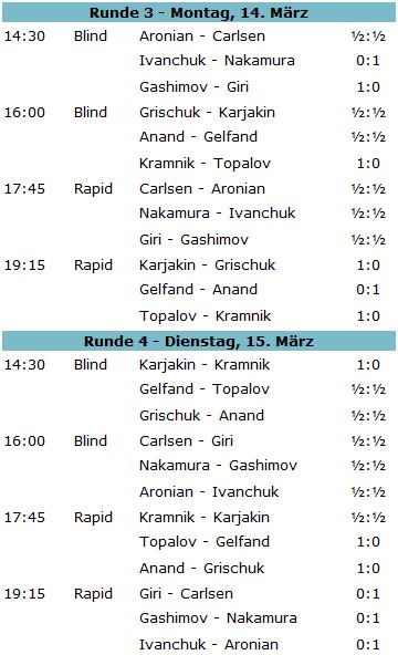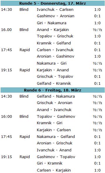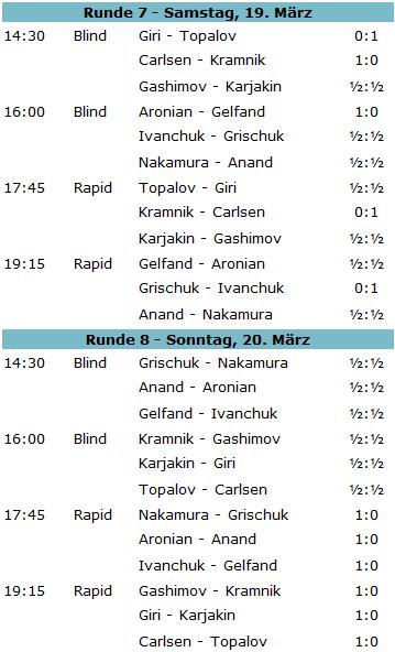 20.03.2011 - In der heutigen achten Runde des Amber Chess Torunament kam es gleich in zweierlei Hinsicht zur Begegnung der besonderen Art. Viswanathan Anand ist der amtierende Weltmeister im "langsamen" Schach und Levon Aronian hält seit 2010 den gleichen Titel im Schnellschach, welchen er dem Inder bei der Chess Classic Mainz abgeluchst hatte. In der Blindpartie waren sich die beiden Champions heute ziemlich rasch einig und teilten den Punkt, doch ein taktischer Überseher Anands beendete die Schnellpartie zu Gunsten Aronians. Somit behauptete der Armenier seine Führung in der Gesamtwertung, doch den Vorsprung vergrößern konnte er nicht, denn sein direkter Verfolger holte ebenfalls 1,5 Punkte. Magnus Carlsen entfachte gegen Veselin Topalov ein taktisches Feuerwerk und spielte den Bulgaren gekonnt aus. Überhaupt waren es nicht zum ersten Mal die Schnellschach-Sessions, die Bewegung in die Gesamtwertung brachten. Sämtliche Blindpartien endeten unentschieden, während alle Schwarzspieler ihre Schnellpartie verloren. Morgen dürfen sich die Spieler zum zweiten und letzten Mal erholen, bevor es dann am Dienstag mit der 9. Runde weitergeht.