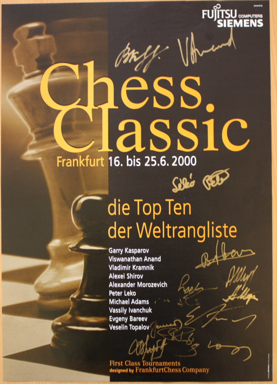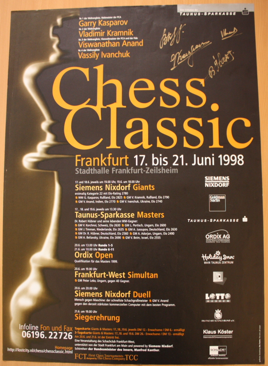 Das von den vier Hauptakteuren signierte Poster der Frankfurt Chess Classic 1997 - Dieses und die Poster sämtlicher Chess Classics können Sie in Kürze bei den Chess Tigers erwerben. Wir informieren Sie darüber auf dieser Seite.