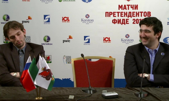 Während Alexander Grischuk bei der Pressekonferenz lieber ganz woanders gewesen wäre, blühte Vladimir Kramnik regelrecht auf und hatte kein Problem mit dem Kurzremis